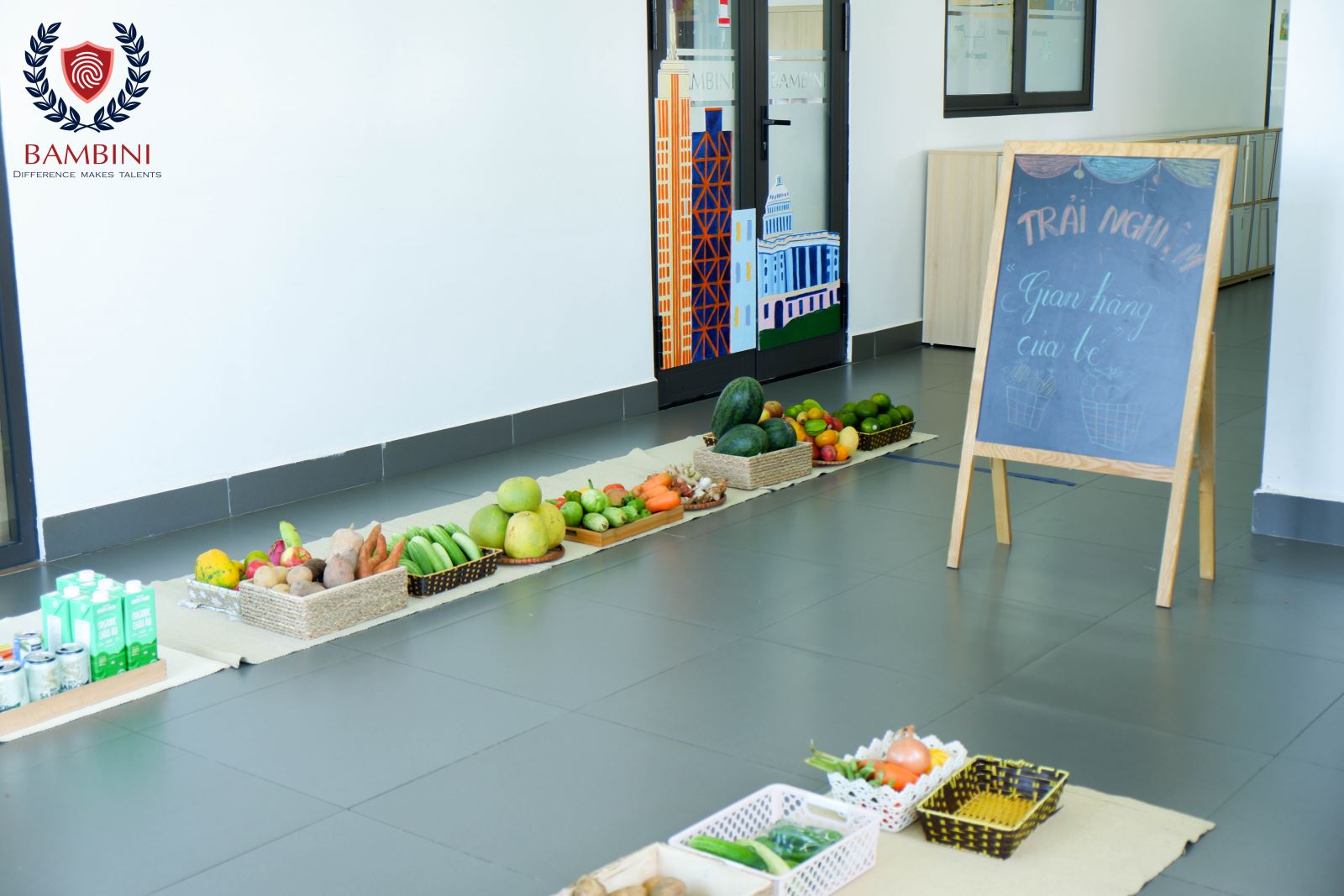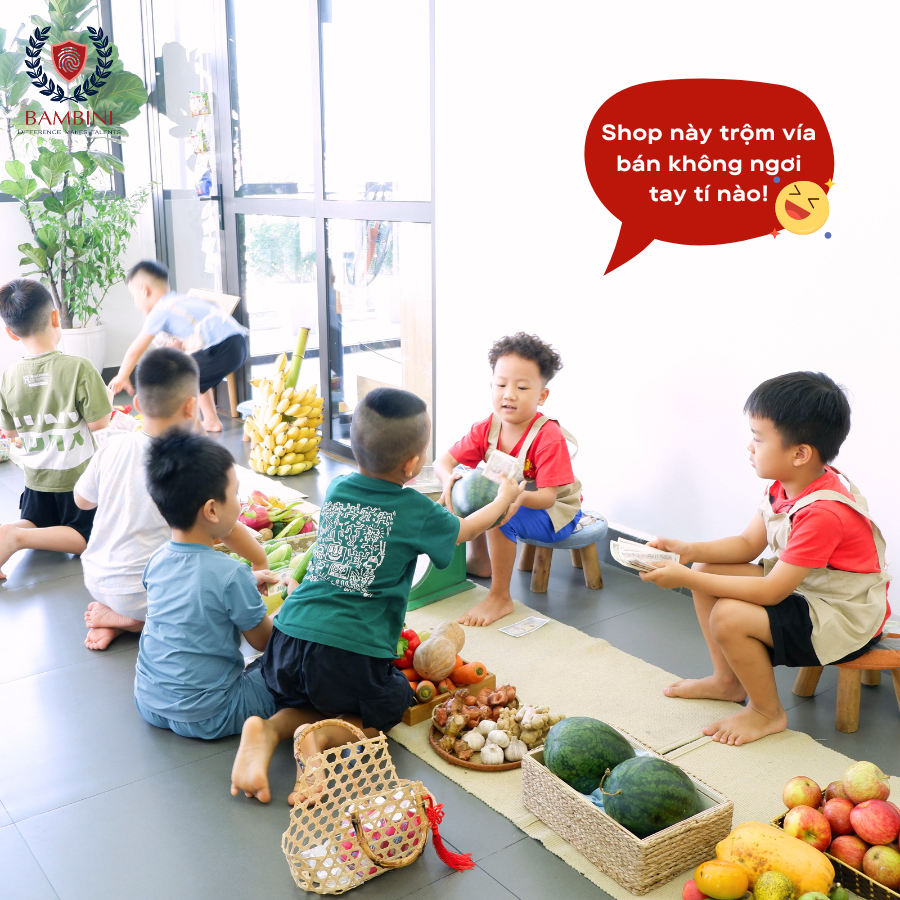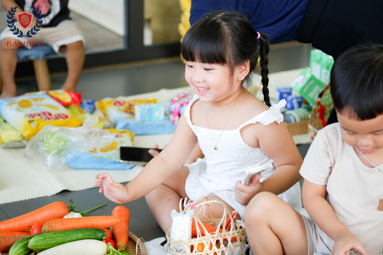 Các con vừa được nhận biết tên gọi, hình dạng của từng loại thực phẩm, vừa tập làm “người bán – người mua” trong phiên chợ mini đáng yêu.