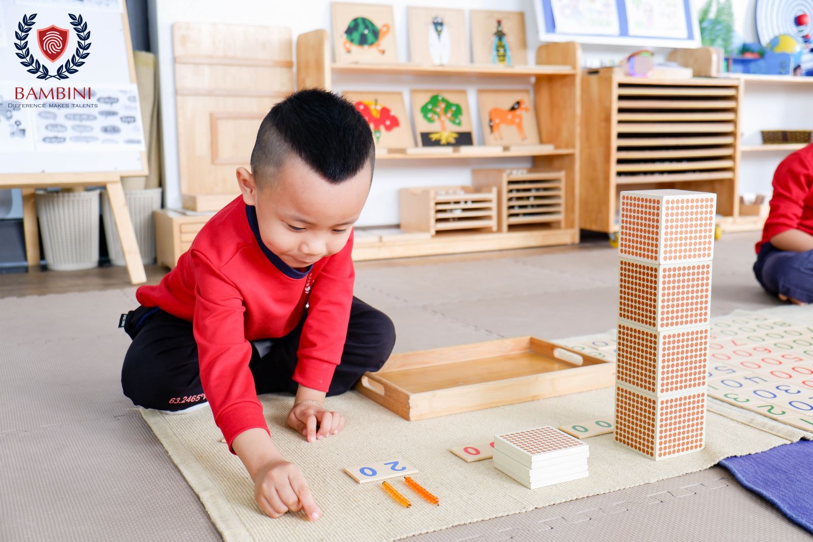Ở Bambini, Toán không bắt đầu bằng những mặt số khô khan 1, 2, 3 mà là sự kết hợp giữa lượng và con số. Mọi bài học đều khởi nguồn từ lượng trước – con số sau, từ việc chạm, cảm nhận, xếp đặt, so sánh rồi mới đi đến khái niệm.