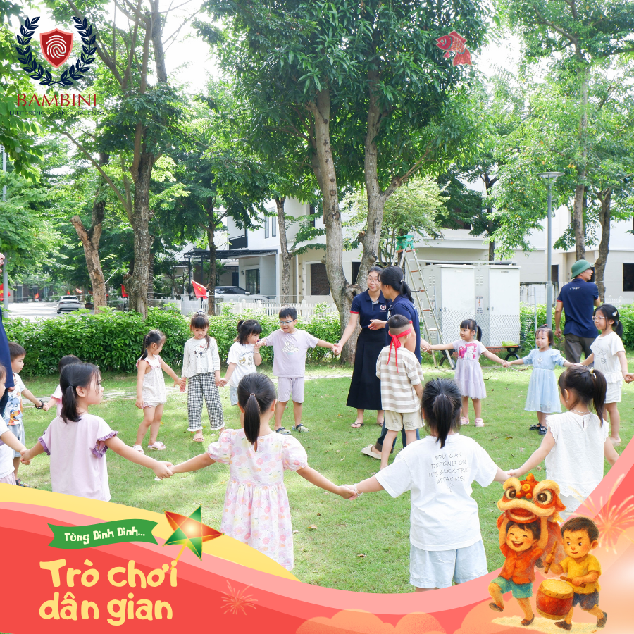 Tiếp nối hành trình Vui Hội Trăng Rằm, các Bambiniers lại được quay ngược thời gian trở về với những trò chơi dân gian gắn liền với tuổi thơ của mỗi chúng ta. Từ nhảy bao bố, bịt mắt bắt dê, ô ăn quan, ném lon... Mỗi hoạt động không chỉ là niềm vui của ngày Rằm tháng 8 mà còn là một bài học văn hóa cổ truyền để giáo dục con trẻ về những nét đẹp truyền thống của dân tộc.